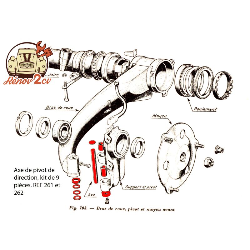Pivot de direction pour 2cv, méhari, dyane et acadiane. Kit 9 pièces pour 1 roue.