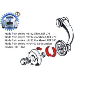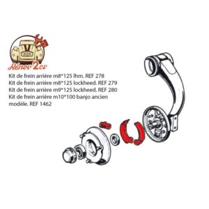 Kit de frein complet pour les 2 roues arrière comprenant: 2 cylindres de roue M9x125 Lockheed, 4 garnitures de frein, 1 kit de ressort de rappel. Livré sans centreurs, ni