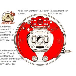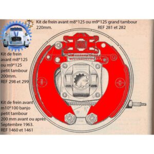 Kit de frein complet pour les 2 roues avant comprenant: 2 cylindres de roue M8x125 lockheed, 4 garnitures de frein diametre 220mm grand tambour, 1 kit de ressort de rappel. Ne