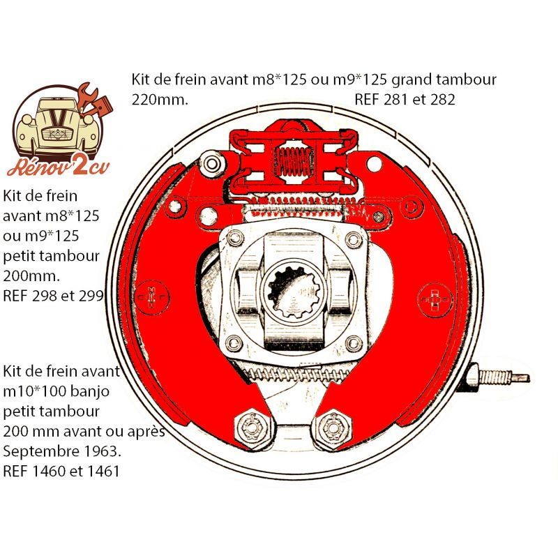 Kit de frein complet pour les 2 roues avant comprenant: 2 cylindres de roue M8x125 lockheed, 4 garnitures de frein diamètre 200mm petit tambour, 1 kit de ressort de rappel.